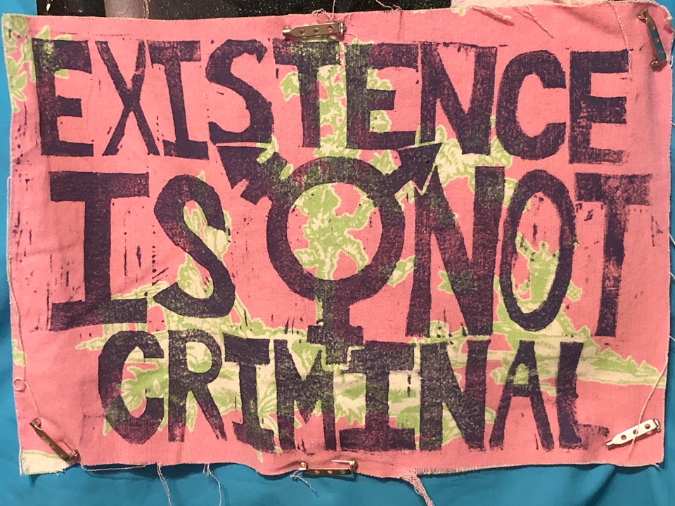 about 11inx9in This back patch states "Existence IS NOT Criminal" with the trans symbol in the middle.